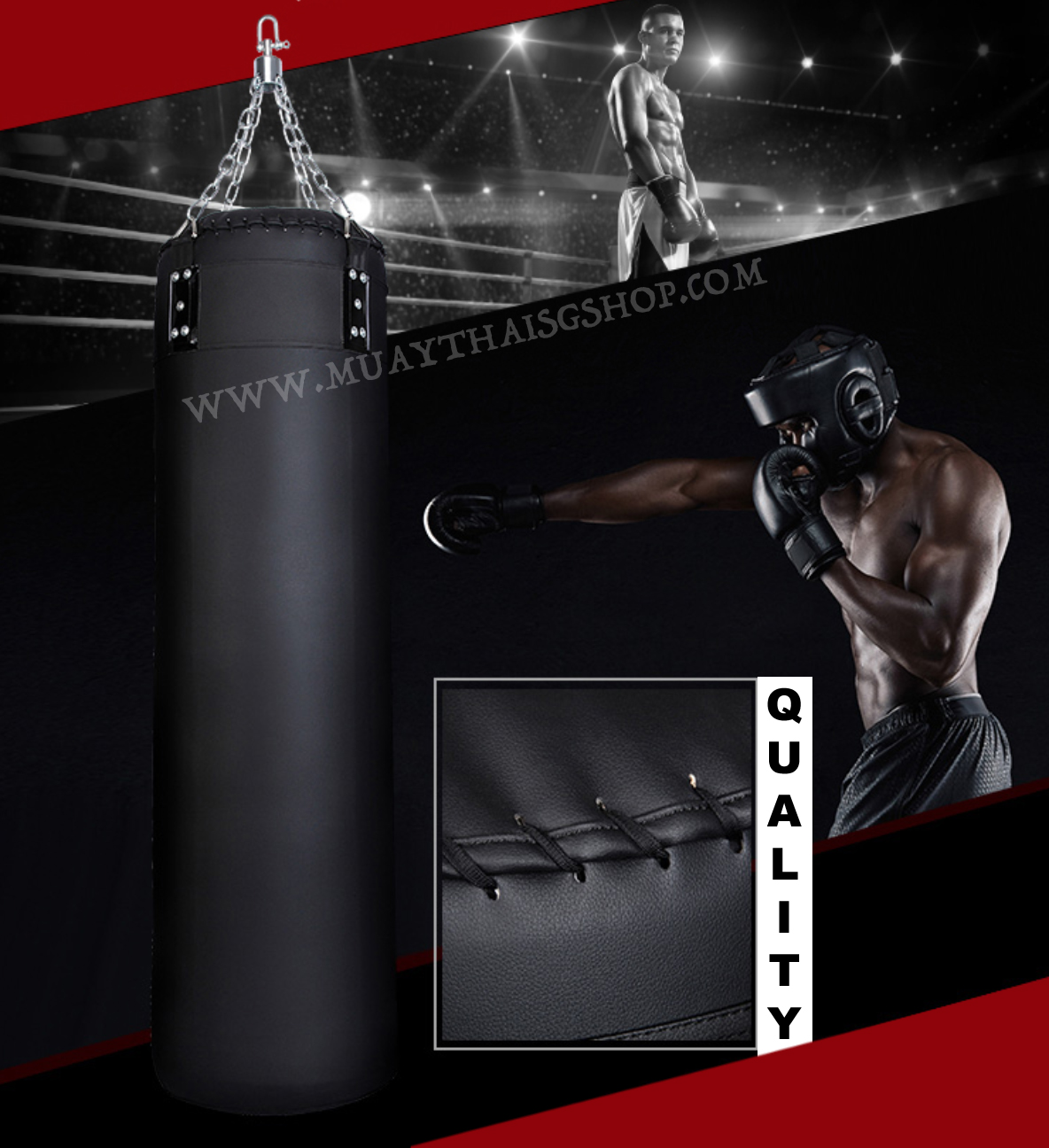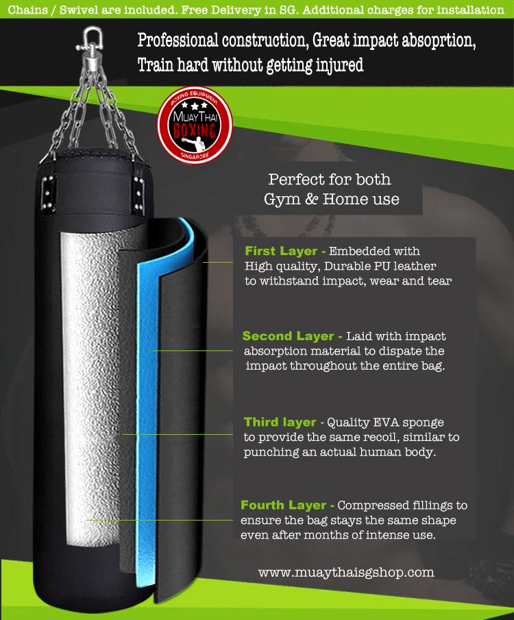 The filling of the bag is quite special. It replicates the feeling of hitting a human body. Soft at the first hit (like body fats, skin etc) but upon driving ur punches harder and further in, the filling seems to be harder (like bones). Especially good for kicks ! The rivet seems quite ok, not sure whether it will hold up the 80kg bag for long lol.. So far a few months already and no signs of wear and tear yet. Installation work is done perfectly and the guy knows his stuff !! Good job