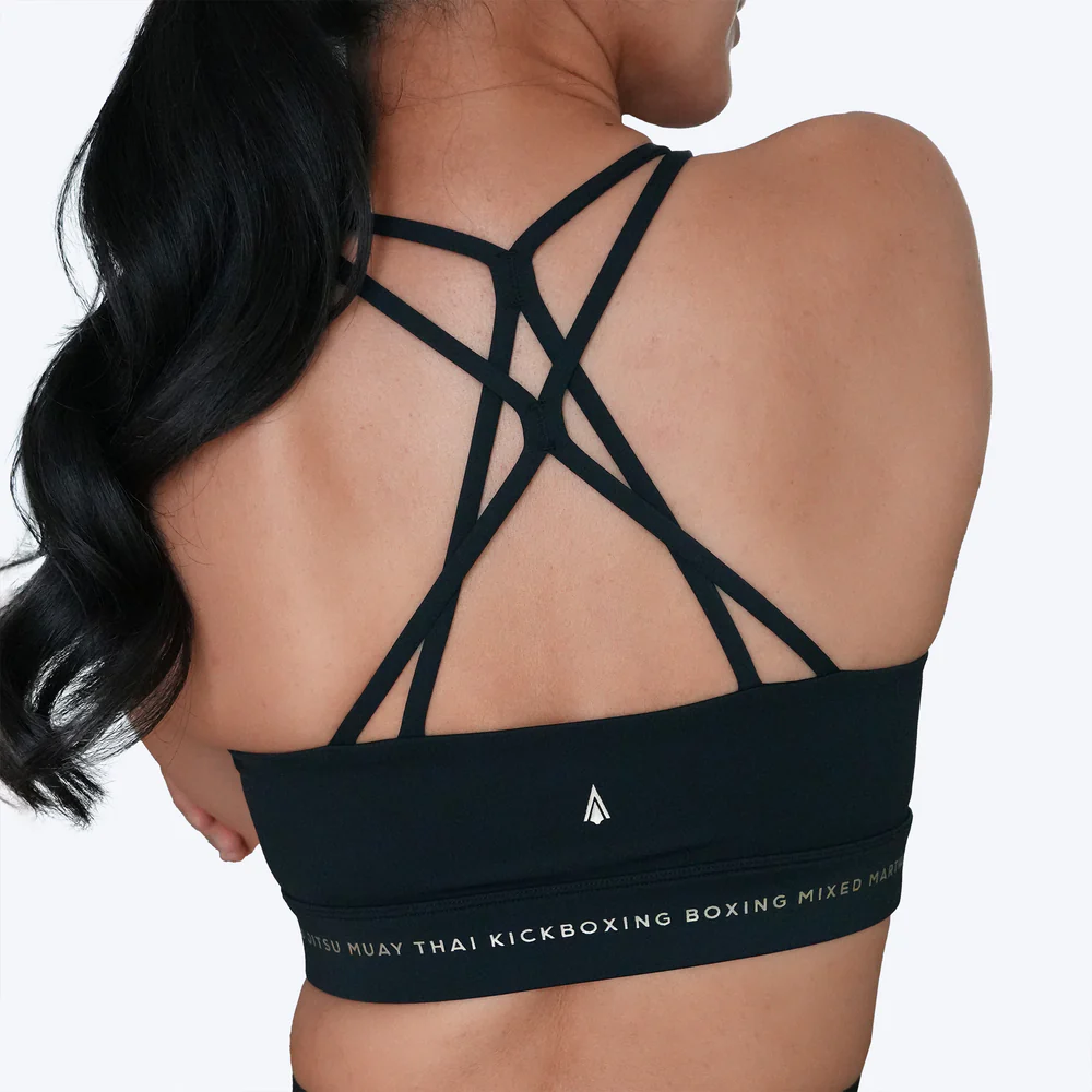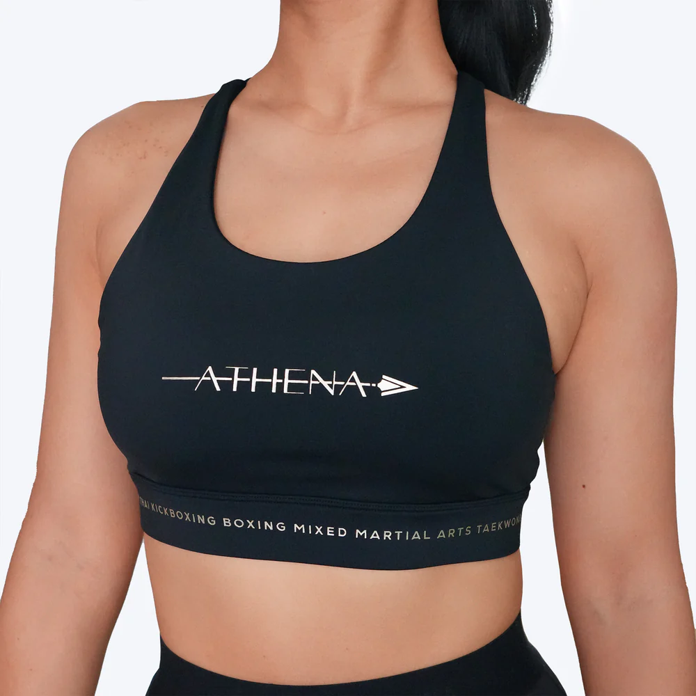 Now with an upgraded crossback design, the Thessalia v2.0 is our version of the classic yoga bra with a little extra length for support and coverage, made for women who fight and perfect for wearing under your Gi. Some familiar martial arts disciplines are imprinted in gold around the waistband – a mark that shows you are part of this fightworld.